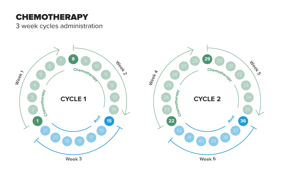 Chemotherapy is given once every three weeks on day one, and this is followed by a rest period for recovery.
