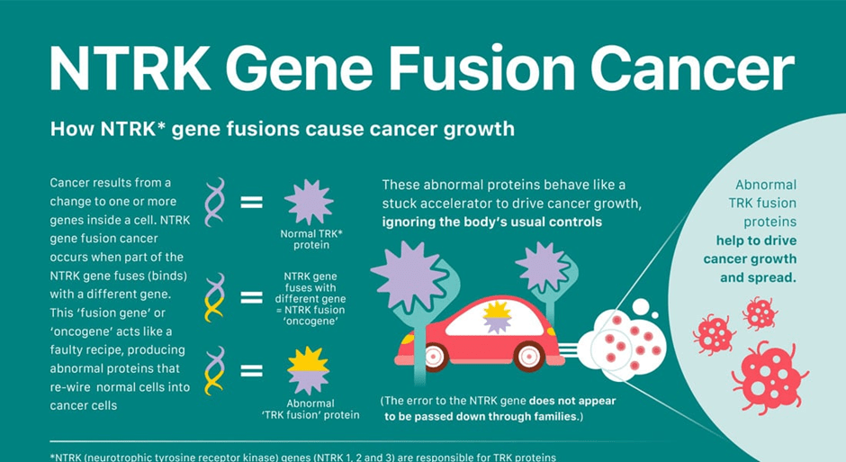 Mutations or rearrangements in the NTRK genes cause fusion to take place. This affects the structure and function of TRK, causing cancer cell growth.