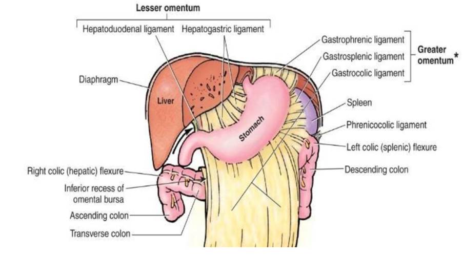 Omentum, otherwise known as the epiploon, links the peritoneum attached to the stomach to other organs. There are two types: major and minor. The major omentum has a high fat content that covers the intestine and insulates, preventing pressure between the organs in the abdomen. Alternatively, the lesser omentum links the stomach with the liver.