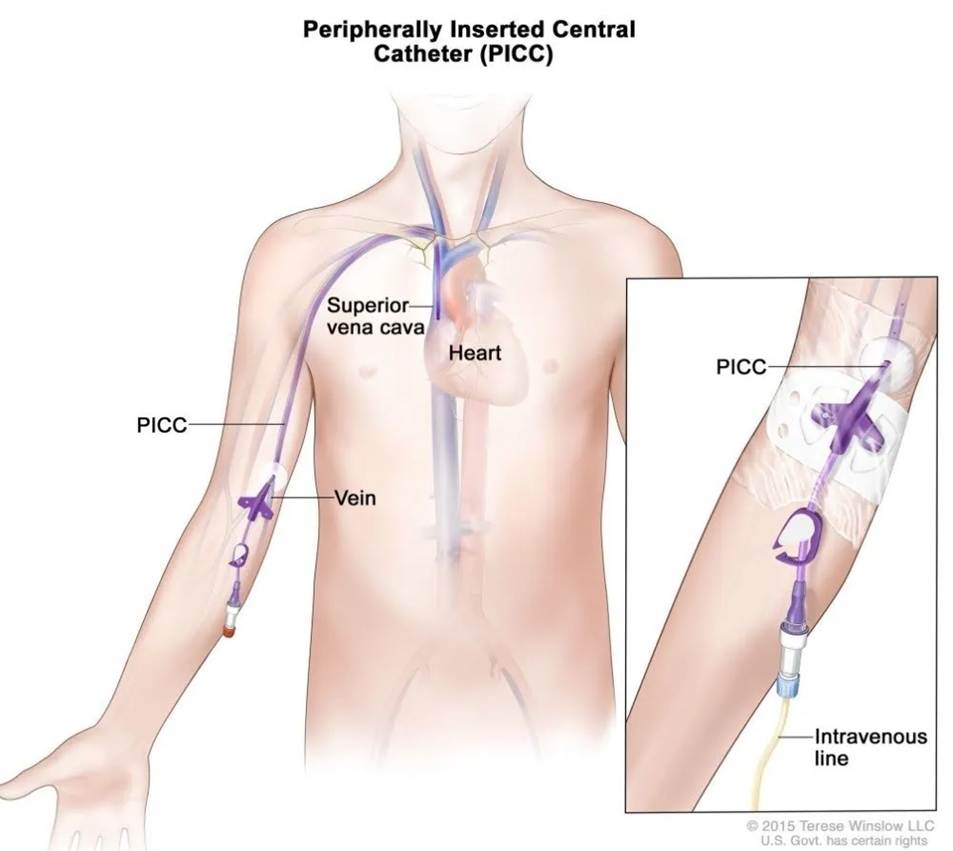 Through the large vein in the chest: This is achieved using a long plastic tube (central, PICC, or portacath) that is kept in position throughout the course of treatment.
