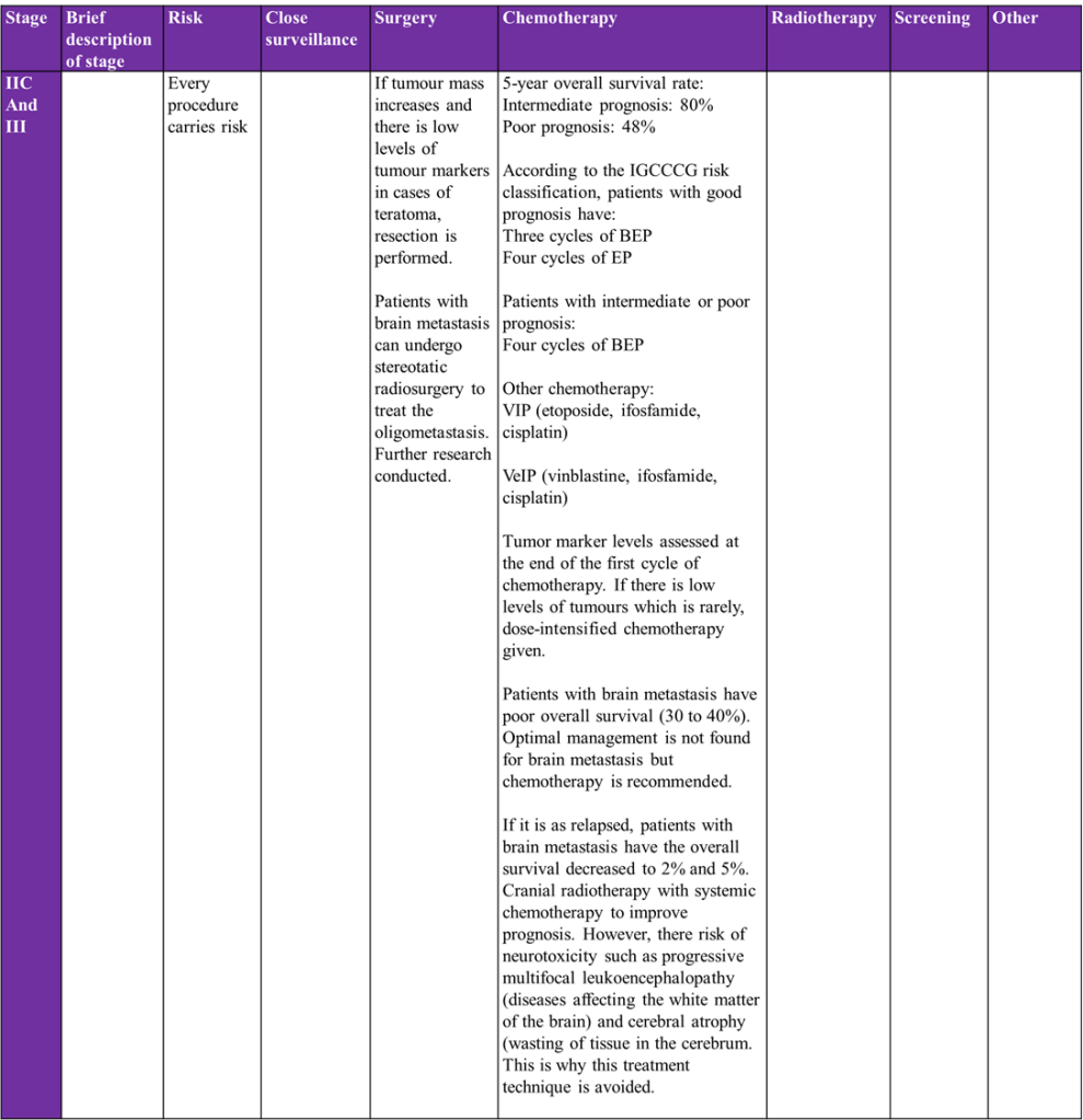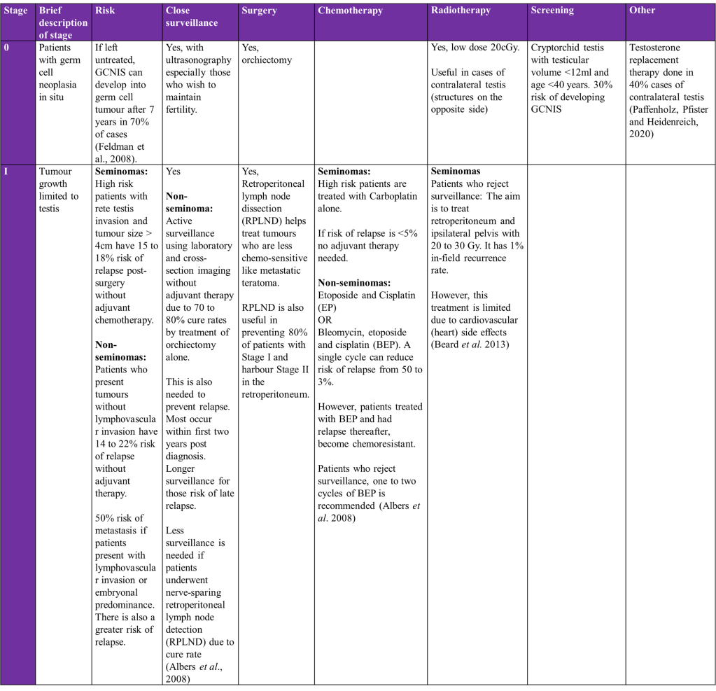 Overview of treatment strategies per clinical stage of testicular cancer was summarised from (Gaddam, Bicer and Chesnut, 2023)