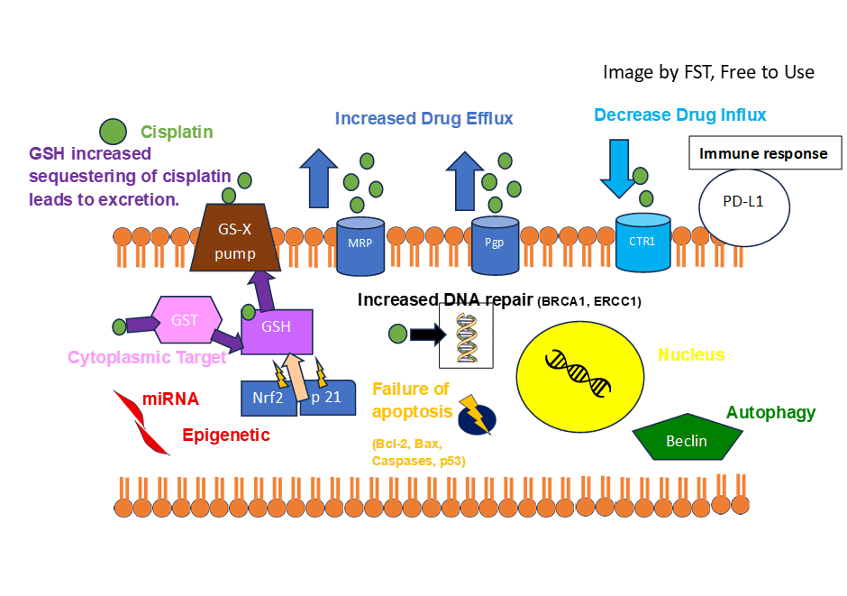 Another resistance mechanism is the increased sequestration of cisplatin by glutathione (GSH). Glutathione is present in the cytoplasm of cells and binds with cisplatin via the enzyme Glutathione S-transferases (GST). The conjugation with the therapeutic drug facilitates the GSH detoxification system, increasing the removal of cisplatin from cancer cells (Mandic et al., 2003). This prevents cisplatin from translocating to the nucleus to induce DNA strand breaks (Kumar, Kushwaha, and Gupta, 2019). Tumour suppressor genes Nrf2 and p21 also partake in cisplatin resistance via regulation of GSH metabolism.