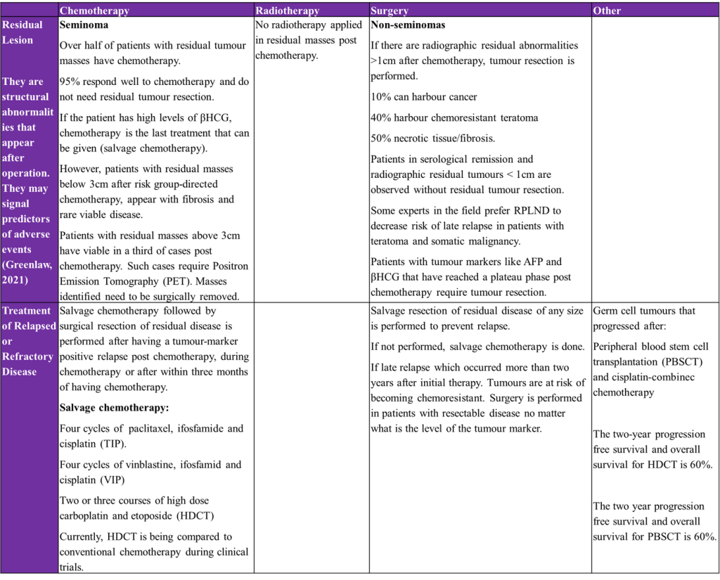 Amongst the common combined chemotherapy regimens applied are: four courses of bleomycin, etoposide and cisplatin (BEP) or etoposide, ifosfamide and cisplatin (VIP). However, if there are residual disease after completing chemotherapy, dissection of associated lymph nodes and or metastases occurs. It is estimated that 10-15% of patient cases where the cancer has spread (disseminated disease) due to relapse or refractory disease will require second-line therapy (Adra and Einhorn, 2017). The type of salvage treatment whether surgery or chemotherapy or radiotherapy is depending on the initial combination therapy used in cisplatin and extent of residual disease.
