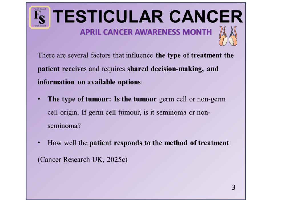 Cancer Research UK (2025c) Treatment options for testicular cancer Available at: https://www.cancerresearchuk.org/about-cancer/testicular-cancer/treatment/treatment-decisions (Accessed: 4th July 2025)