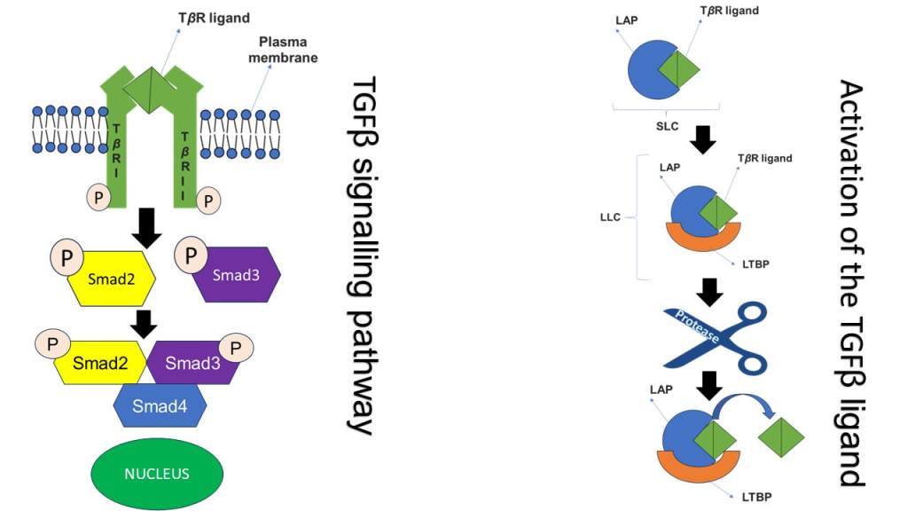 The second image presents the activation of the TGF ligand (green). A complex is formed between the C-terminal prodomain latency-related peptide (blue; LAP) with the TGF ligand to form a small latency complex (SLC). The SLC binds with the TGF-β binding protein 1 (orange; LTBP1) to produce a large latent complex (LLC). LLC interacts with protease enzymes. The LLC releases the TGF-β ligand to become active. The TGF-β can bind with the receptor by stimulating LAP or LTBP. To activate the receptor. A larger size of the image can be found in the resource list.