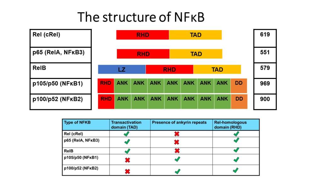 The image presents the structure of the Nuclear factor kappa-light-chain-enhancer of activated B cells (NFκB). The transcription factor has five subunits: Rel (cRel), p65 (RelA, NFκB3), RelB, p105/p50 (NFκB1) and p100/p52 (NFκB2). Within each subunit, several types of domains are distinctive to one another. The Transactivation domain (TAD; light orange) activates transcription of genes. Rel-homologous domain (RHD; red) is where DNA binds, dimerization between the same members and different membranes to translocate into the nucleus. Ankyrin repeats (green) have an inhibitory role. Some types have TAD and RHD whereas, other kinds of NFκB have ankyrin and RHD. Some types of NFκB have a leucine zipper domain (LZ; blue), for instance, RelB that can recognize specific DNA sequences and contains lots of leucine residues. NFκB1 and NFκB2 subtypes have death domains (DD; orange) that promote protein-protein interactions. A larger size of this image is found in the resource list.