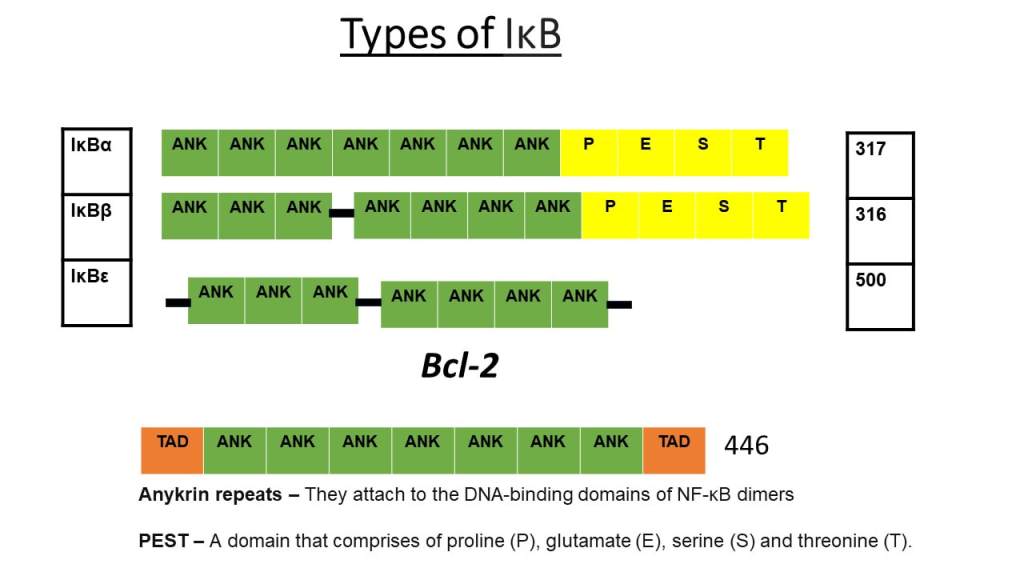 The image presents the structure of IKB, inhibitory proteins of dimers that transduce signals inside the cell. The three main types are IKBα, which prevents p50/RelA heterodimer. IKBB prevents RelA/cRel heterodimer. IKBε prevents RelA and c rel dimers. Ankyrin repeats (green) reside in all types of IKB. A domain of amino acids: proline, glutamate, serine, and threonine (PEST; yellow) are in IKB-alpha and IKB-beta. IKBε has all ankyrin repeats. Some nuclear IKB inhibit and activate NFKB transcription of genes. A larger size of this image is found in the resource list.