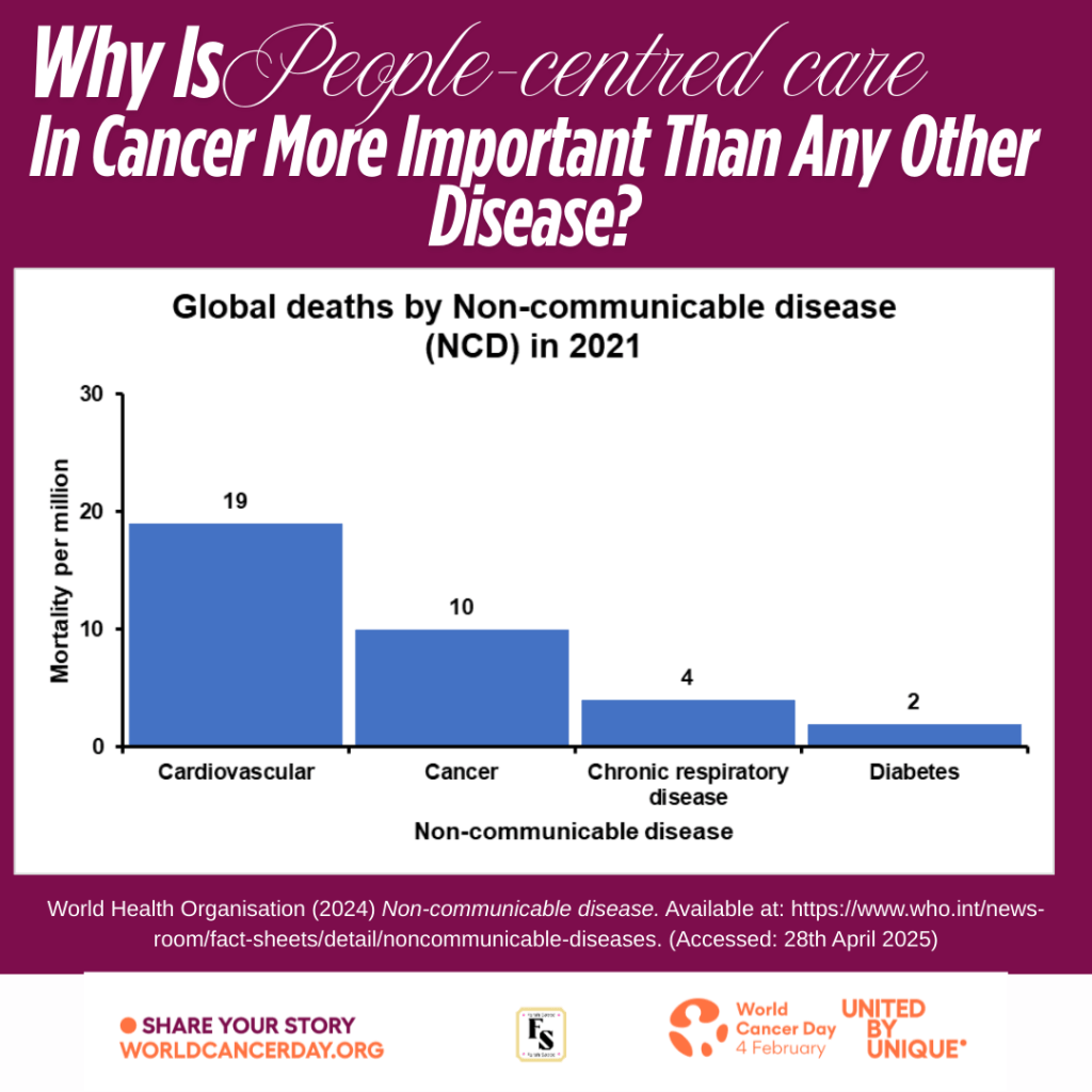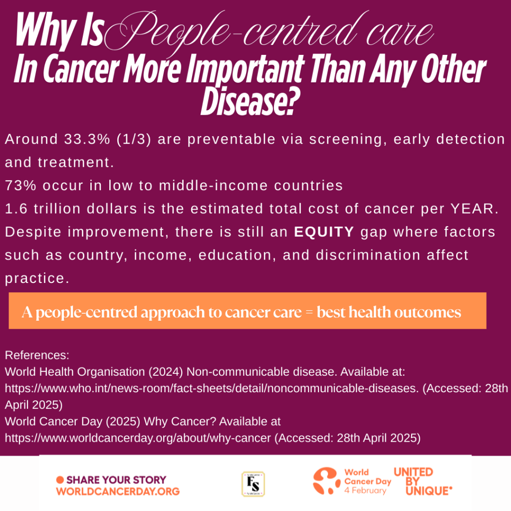 World Cancer Day announced three objectives to facilitate people-centred care. In 2025, the unique stories of patients will be heard to identify and understand their holistic needs. In 2026, advocacy of the patients’ experiences to apply people-centered care in strategic plans organized by the National Health Service, policymakers, and the general public. This will help to induce systemic changes in 2027 through strengthening existing partnerships in the healthcare system and developing new collaborations.