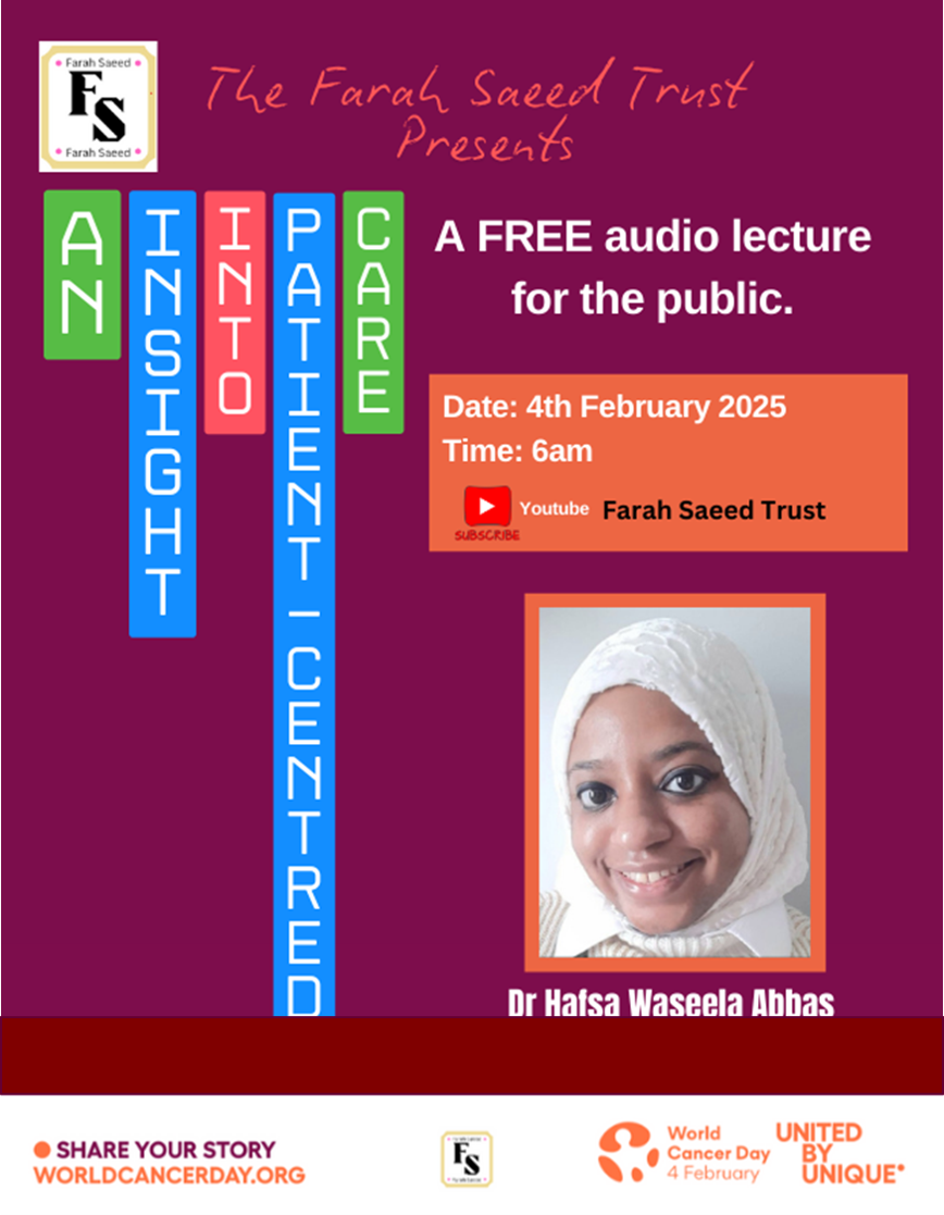 This is a lecture on YouTube which you can watch at your free time where Dr Hafsa Waseela Abbas aims to share why is it important to prioritise patient care especially in cancer and measures taking place to facilitate this in the UK and what World Cancer Day team are aiming to do as part of UnitedByUnique campaign.